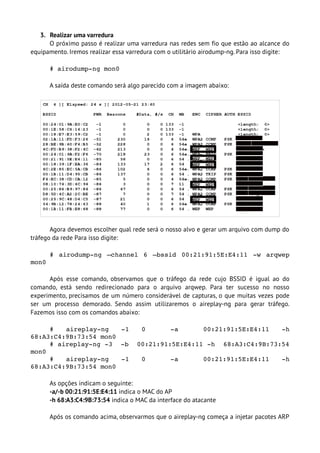 Este documento descreve como quebrar a criptografia WEP em redes sem fio usando ferramentas como aircrack-ng. Ele explica como ativar o modo monitor, realizar uma varredura na rede, gerar tráfego usando aireplay-ng e então usar o aircrack-ng para descobrir a senha WEP capturando pacotes.