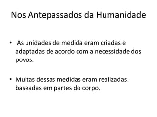 As unidades de medida eram originalmente baseadas em partes do corpo humano, como o cúbito egípcio e o palmo. Os sistemas de medição variavam entre regiões e criavam problemas para o comércio. Em 1789, a França estabeleceu o Sistema Internacional de Unidades, definindo o metro, litro e quilograma como padrões universais.