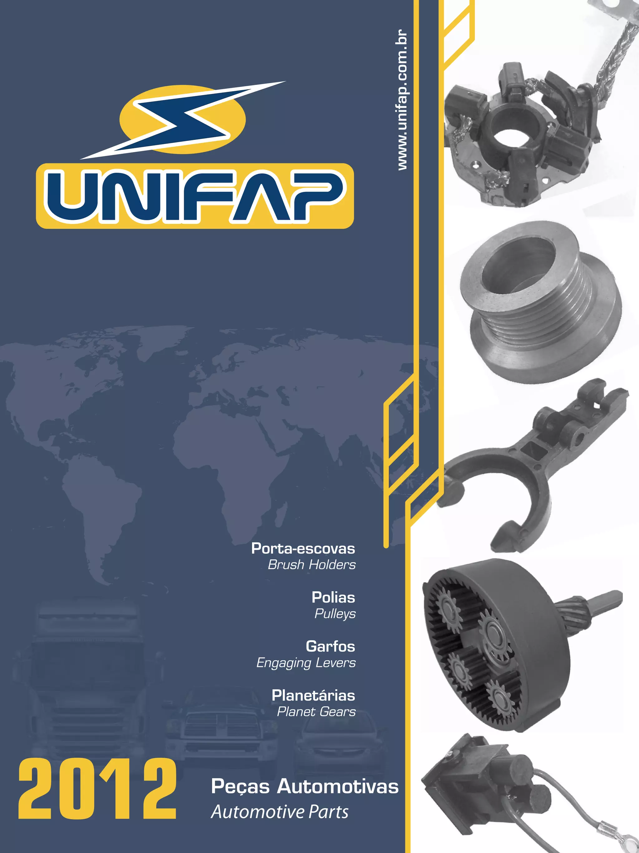 O documento descreve a empresa UNIFAP INDÚSTRIA METALÚRGICA LTDA, fundada em 1992 para fabricar peças automotivas de alta qualidade. A empresa cresceu para ter instalações de 5.600 m2 e produz itens como porta-escovas para motores, polias e engates. A UNIFAP exporta para a América do Sul, África, Egito, Europa e América do Norte e investe constantemente em qualidade, automação e atendimento ao cliente.