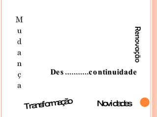 O documento discute as mudanças nas organizações e como os líderes devem lidar com elas. Aponta que tudo muda constantemente e que os líderes precisam acompanhar essas mudanças, preparando suas equipes para novas oportunidades e desafios por meio de treinamento e motivação. Também enfatiza a importância de enfrentar as mudanças sem medo e continuar lutando mesmo quando acontecem problemas.