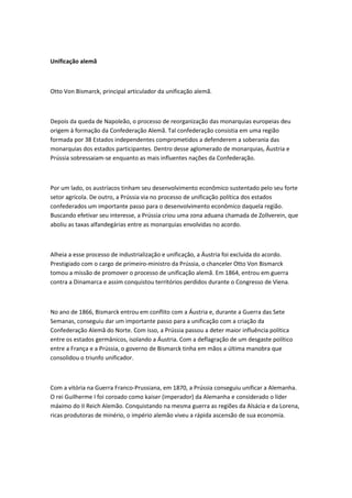 O processo de unificação da Alemanha ocorreu sob a liderança de Otto von Bismarck, primeiro-ministro da Prússia, que promoveu guerras contra a Dinamarca e Áustria para isolar esta última e estabelecer a Confederação Alemã do Norte sob domínio prussiano. A vitória na Guerra Franco-Prussiana permitiu a unificação do restante dos estados alemães, culminando no estabelecimento do Império Alemão.