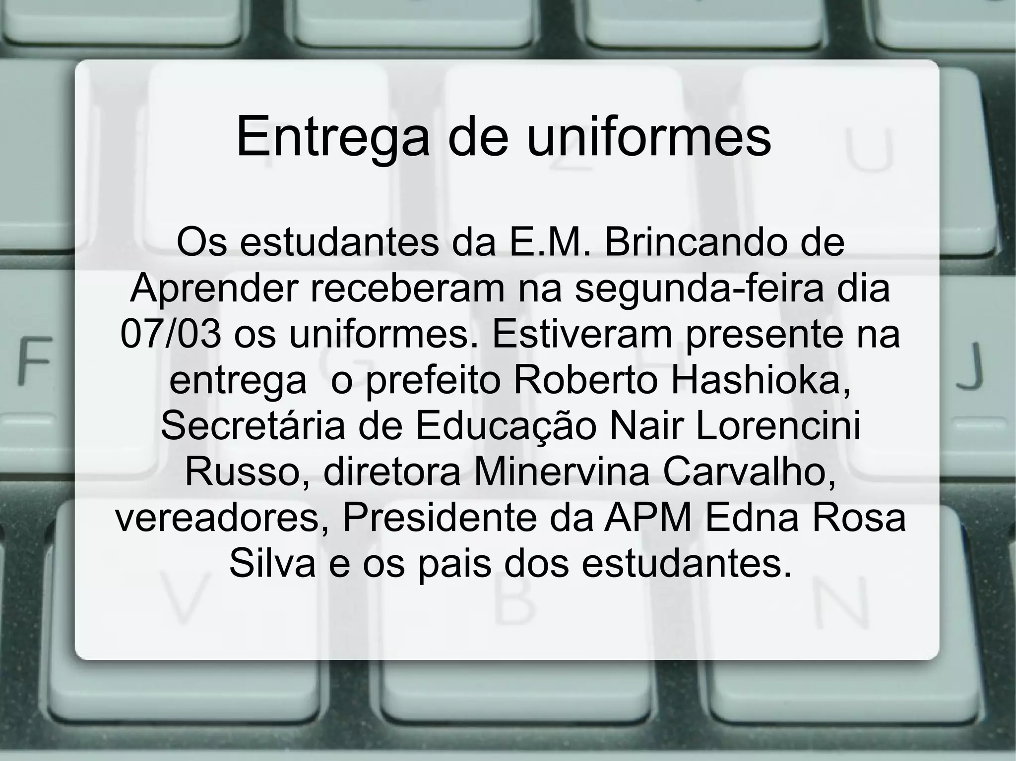 Os estudantes da escola E.M. Brincando de Aprender receberam seus uniformes escolares na segunda-feira, dia 07/03. A entrega contou com a presença do prefeito, secretária de educação, diretora da escola, vereadores, presidente da associação de pais e mães e pais dos estudantes.