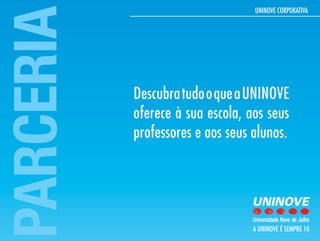 O documento descreve o programa UNINOVE na Escola, que oferece parcerias entre a UNINOVE e escolas para proporcionar benefícios aos alunos, professores e escolas. Os alunos têm acesso a visitas à UNINOVE, reforço escolar, cursos gratuitos e orientação vocacional. Os professores recebem incentivos e palestras. As escolas podem participar de eventos e atividades sociais com a UNINOVE.