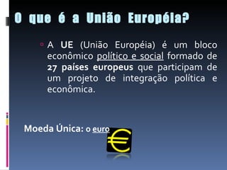 A União Européia é um bloco econômico, político e social formado por 27 países europeus para integrar suas economias e políticas. Sua origem remonta à Primeira Guerra Mundial, mas os principais marcos foram a Comunidade Europeia do Carvão e do Aço em 1950 e os Tratados de Roma em 1957 que criaram a Comunidade Econômica Europeia. Os tratados posteriores ampliaram a cooperação para novas áreas como moeda única e política externa comum.