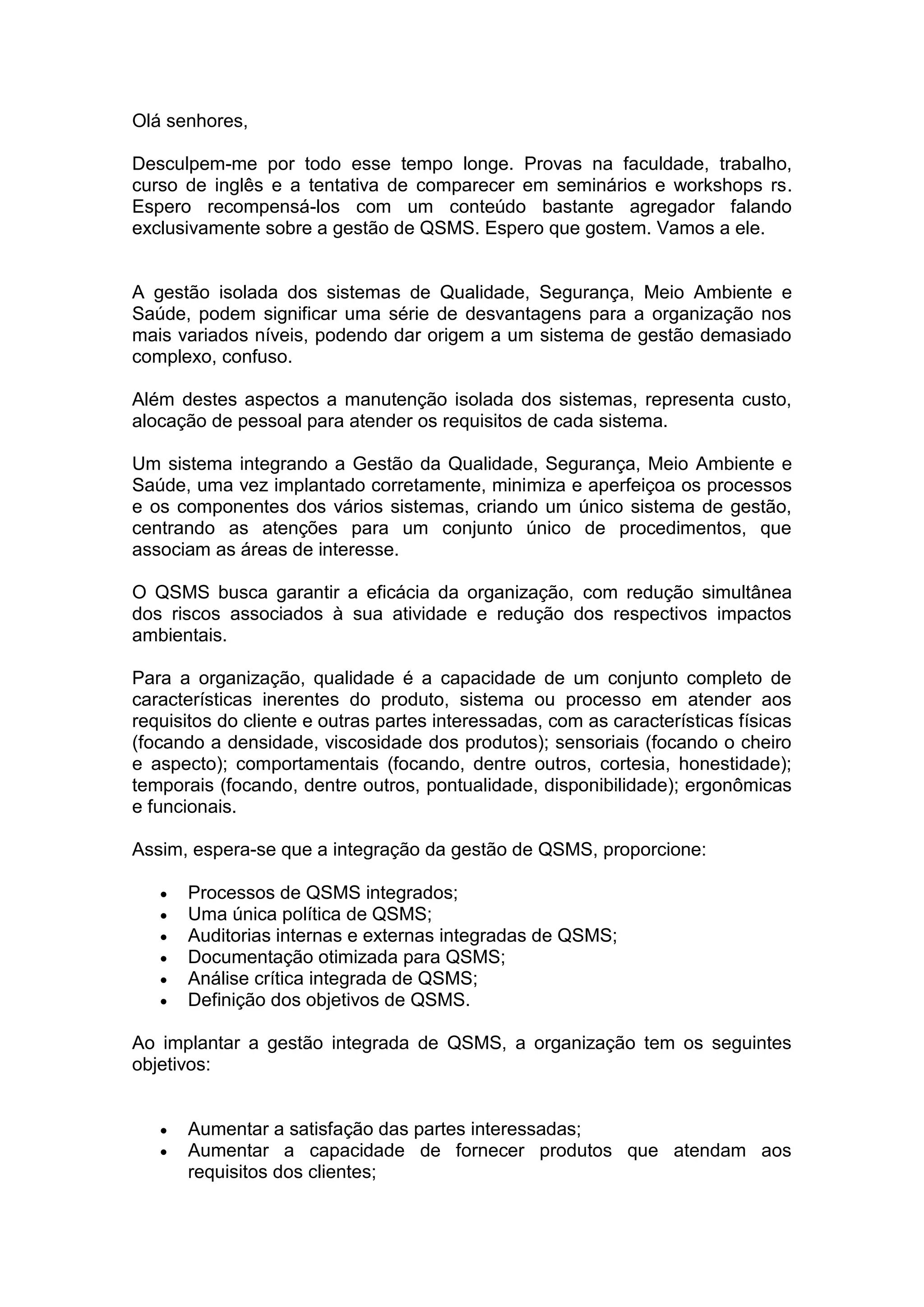 O documento discute os benefícios de um Sistema de Gestão Integrada de Qualidade, Segurança, Meio Ambiente e Saúde (SGISMS). A gestão isolada desses sistemas pode ser complexa e cara, enquanto uma abordagem integrada pode otimizar processos, reduzir custos e riscos, e satisfazer melhor as partes interessadas. Um SGISMS bem implementado leva a processos, políticas, auditorias e documentação integradas entre as áreas, com foco nos objetivos compartilhados de qualidade, segurança, meio amb