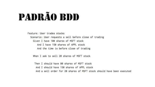 O documento aborda a importância dos testes em aplicações JavaScript, detalhando os tipos de testes, como unitários e de integração, e descrevendo frameworks e ferramentas como Jasmine, Karma e WebdriverIO. Também menciona a metodologia de desenvolvimento orientado a testes (TDD) e desenvolvimento orientado a comportamento (BDD), além de exemplos práticos de escrita de testes. Links úteis para recursos adicionais e melhores práticas em testes de software são fornecidos.