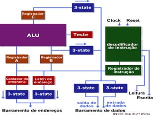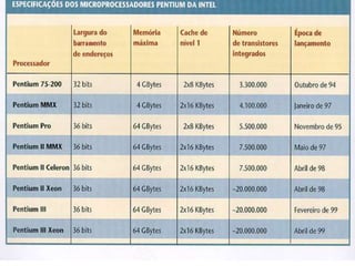 O documento discute a evolução dos processadores desde o primeiro microprocessador Intel 4004 lançado em 1971 até os processadores atuais. Detalha as principais fabricantes de processadores como Intel, AMD, Cyrix e IDT e seus modelos mais conhecidos.