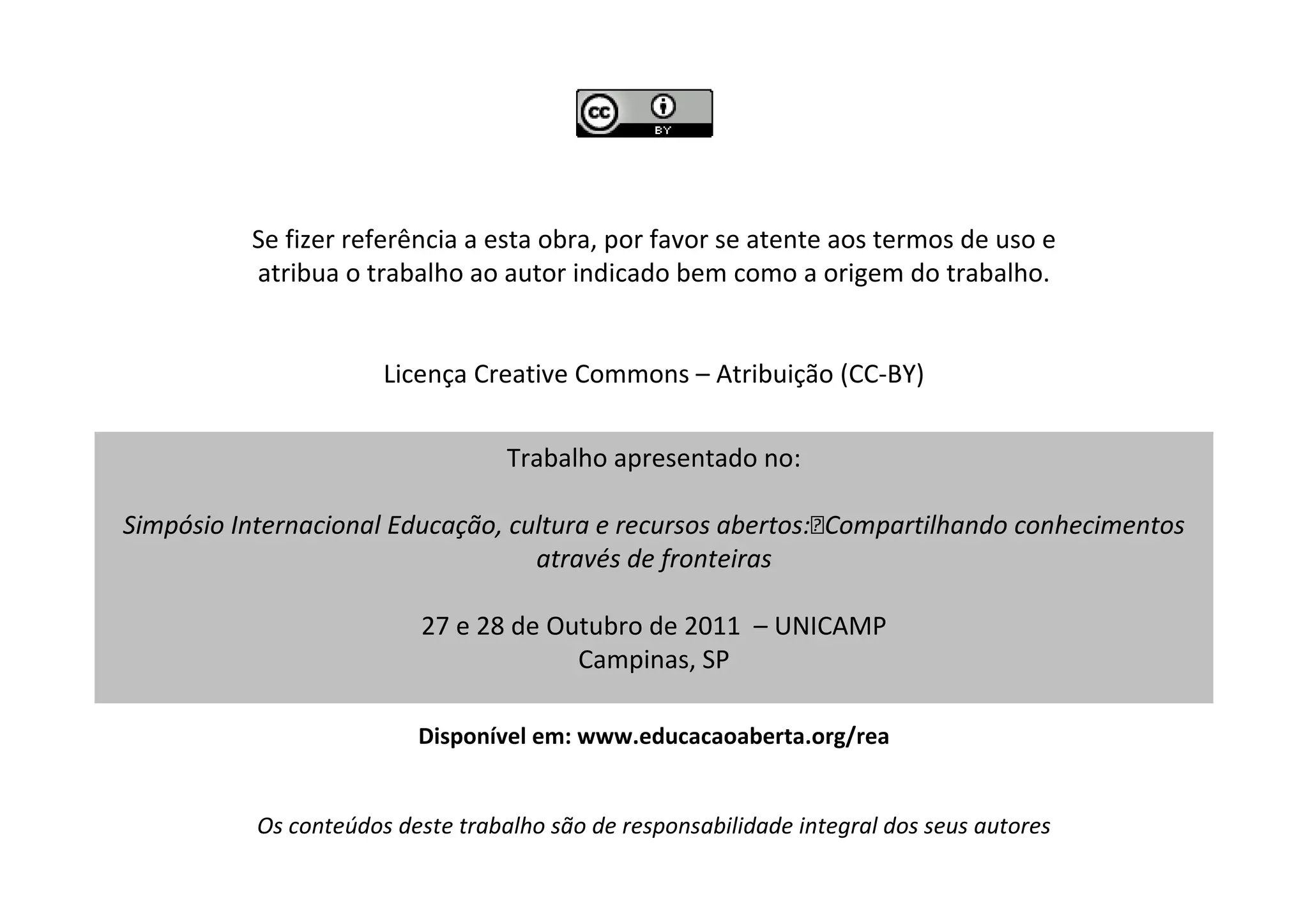 Este documento discute a importância de se atentar aos termos de uso e atribuição de autoria ao utilizar obras sob a licença Creative Commons - Atribuição. Ele também fornece informações sobre o evento no qual o trabalho foi apresentado.