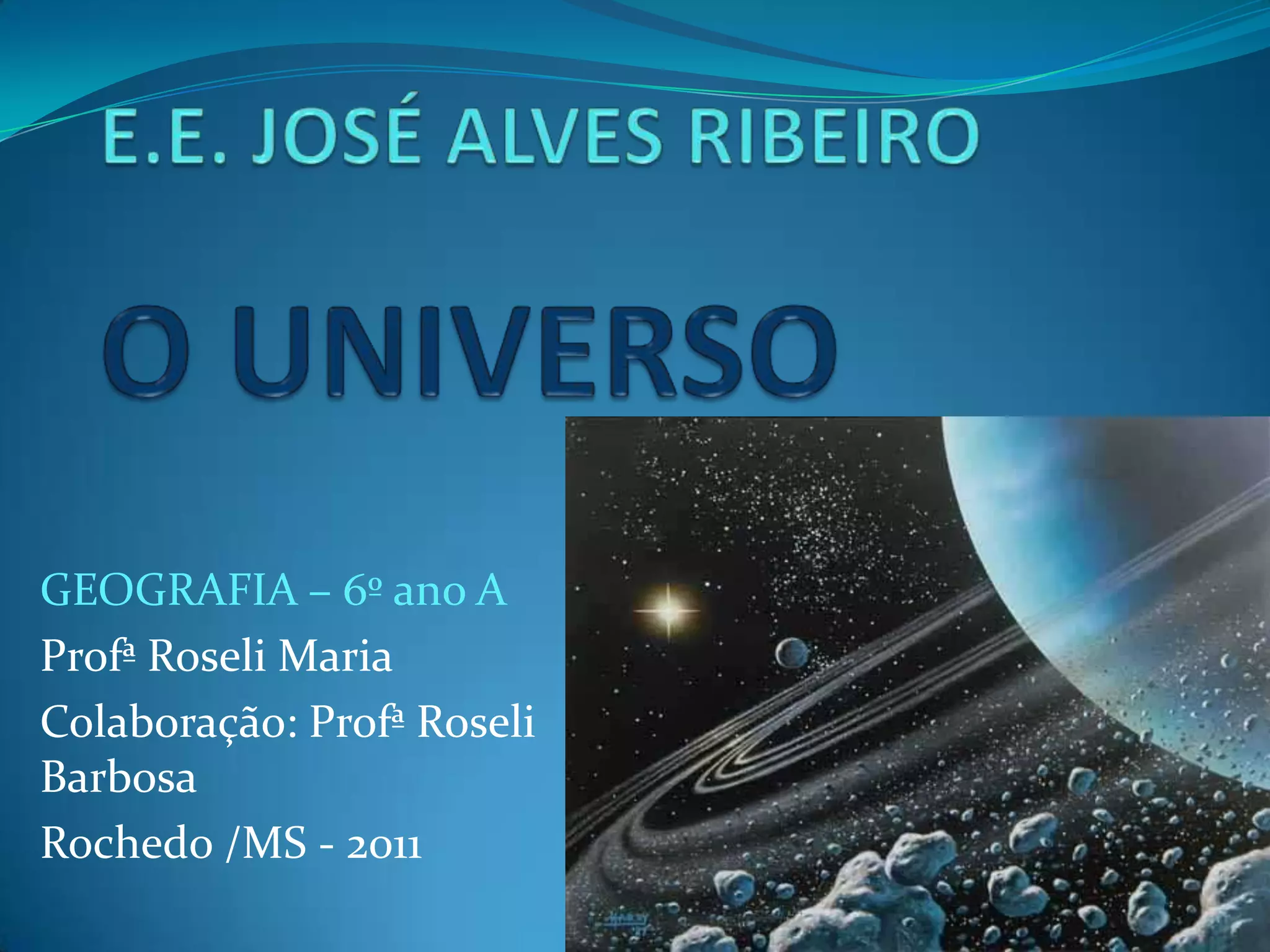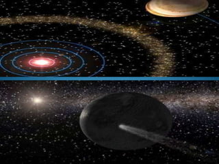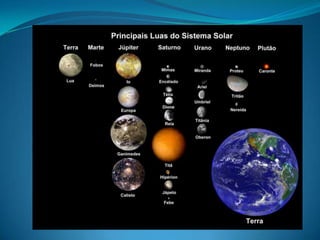 O documento descreve os principais corpos celestes que compõem o Universo, incluindo estrelas, planetas, luas, cometas, asteróides e galáxias. Explica que o Universo contém bilhões de galáxias formadas por agrupamentos estelares unidos pela gravidade. Também detalha as características dos planetas do Sistema Solar e de outros objetos como luas e cometas.