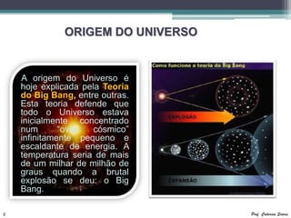 [1] A origem do Universo é explicada pela Teoria do Big Bang, que defende que todo o Universo estava inicialmente concentrado num "ovo cósmico" e explodiu há bilhões de anos; [2] O Sistema Solar localiza-se na Via Láctea e é constituído por planetas, asteróides, cometas e outros corpos que orbitam o Sol; [3] A Terra realiza os movimentos de rotação, translação e revolução.