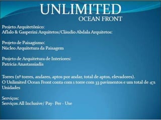 O documento lista os serviços sem custo adicional incluídos para unidades de um empreendimento, como recepção bilíngue 24 horas, equipe de segurança 24 horas, concierge bilíngue para reservas e agendamentos de serviços terceirizados, internet sem fio, coleta seletiva de lixo, arrumação das unidades e manobrista.