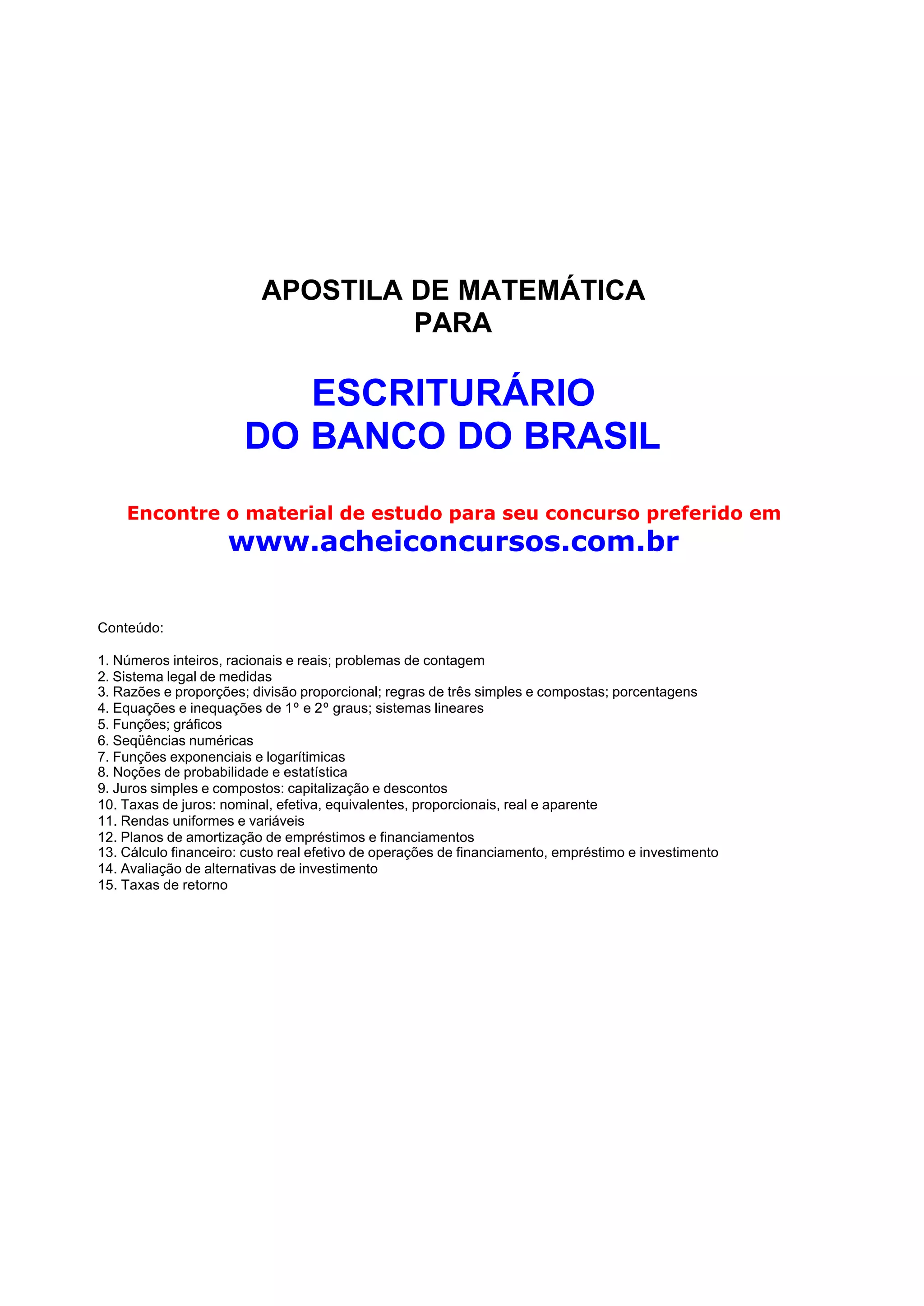 O documento fornece um resumo dos principais tópicos de matemática para escriturários do Banco do Brasil, incluindo números, medidas, proporções, equações, funções, sequências, probabilidade e finanças.