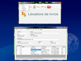 Este documento resume um projeto de desenvolvimento de um sistema de locação de livros. O projeto aborda conceitos como usabilidade, detalhamento de casos de uso, códigos para cadastro e consulta no sistema e custos para disponibilização do acesso à internet. O objetivo é demonstrar esses conceitos através da implementação de um cadastro e busca no sistema de locação.