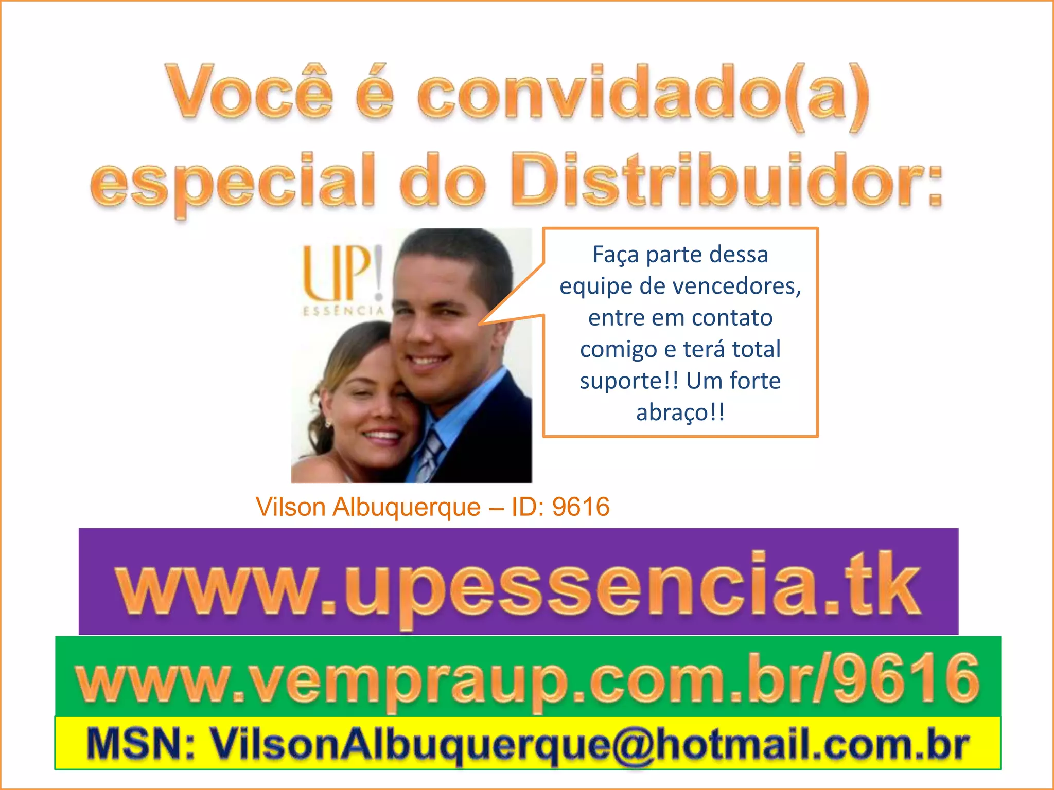 Vilson Albuquerque convida o leitor a fazer parte de sua equipe, oferecendo suporte total. Ele fornece seus contatos em vários canais como site, e-mail e MSN para que o leitor possa entrar em contato e participar deste grupo de vencedores.