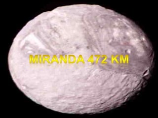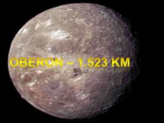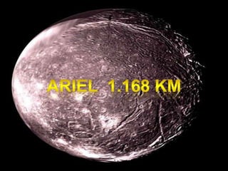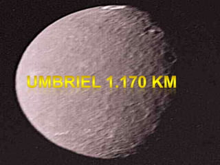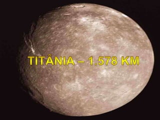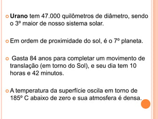 Urano tem um núcleo rochoso envolvido por uma atmosfera densa de gelo, metano e amônia. Sua inclinação axial única faz com que seus polos recebam luz solar durante longos períodos. Possui 11 anéis azuis e 27 luas, incluindo Titânia, Oberon, Ariel e Umbriel.