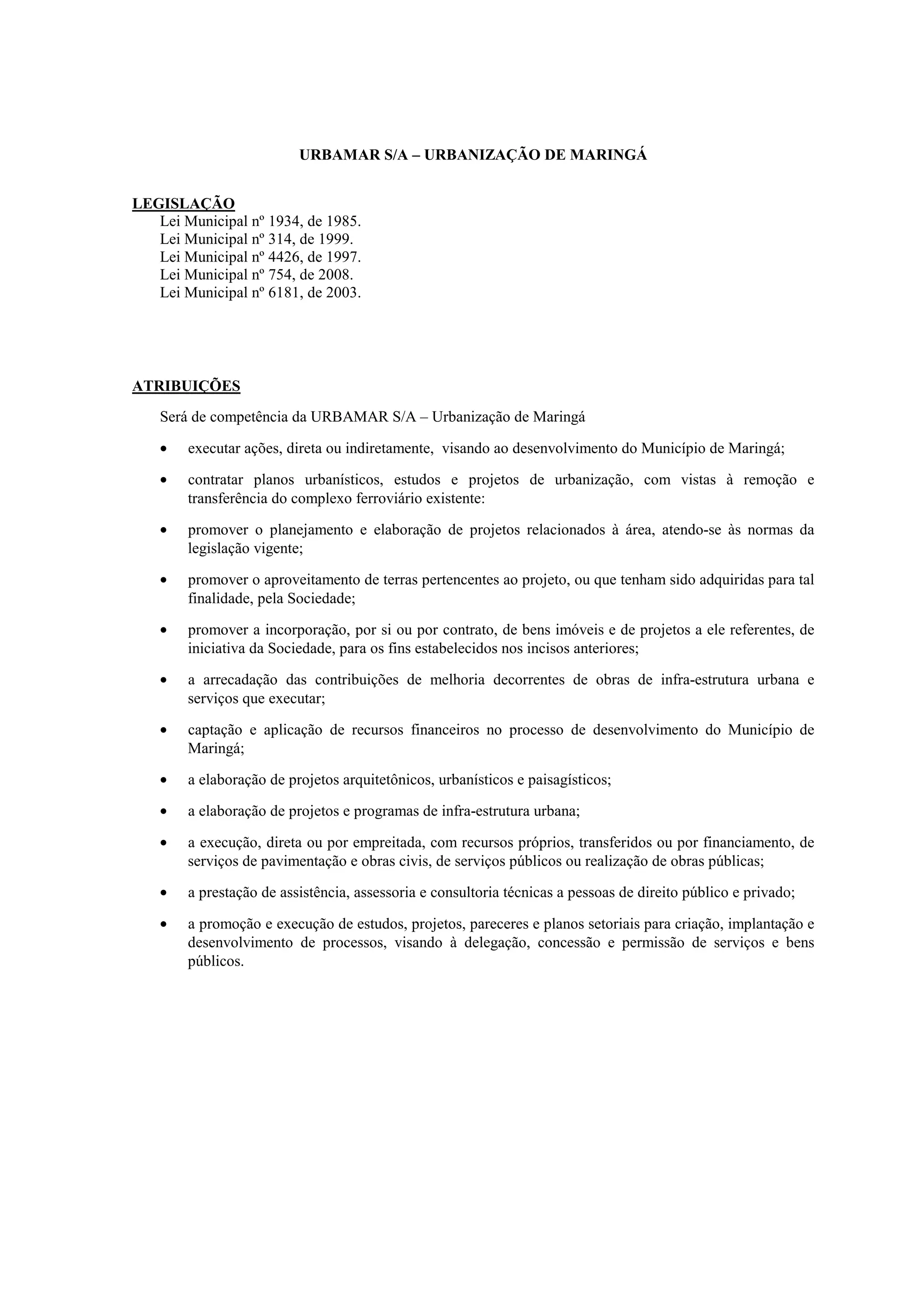 O documento descreve a legislação e atribuições da URBAMAR S/A, uma empresa de urbanização de Maringá. A empresa é responsável por projetos urbanísticos, captação de recursos, elaboração de projetos de infraestrutura e execução de obras públicas. O documento também apresenta demonstrações contábeis da receita e despesa da empresa.