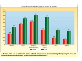 O documento discute os conceitos de urbanização, cidade e município. Apresenta as causas e processos de urbanização e como as cidades evoluíram ao longo da história, desde suas origens até a Revolução Industrial e a atualidade. Também aborda temas como hierarquia urbana, problemas ambientais urbanos e o crescimento acelerado das cidades.