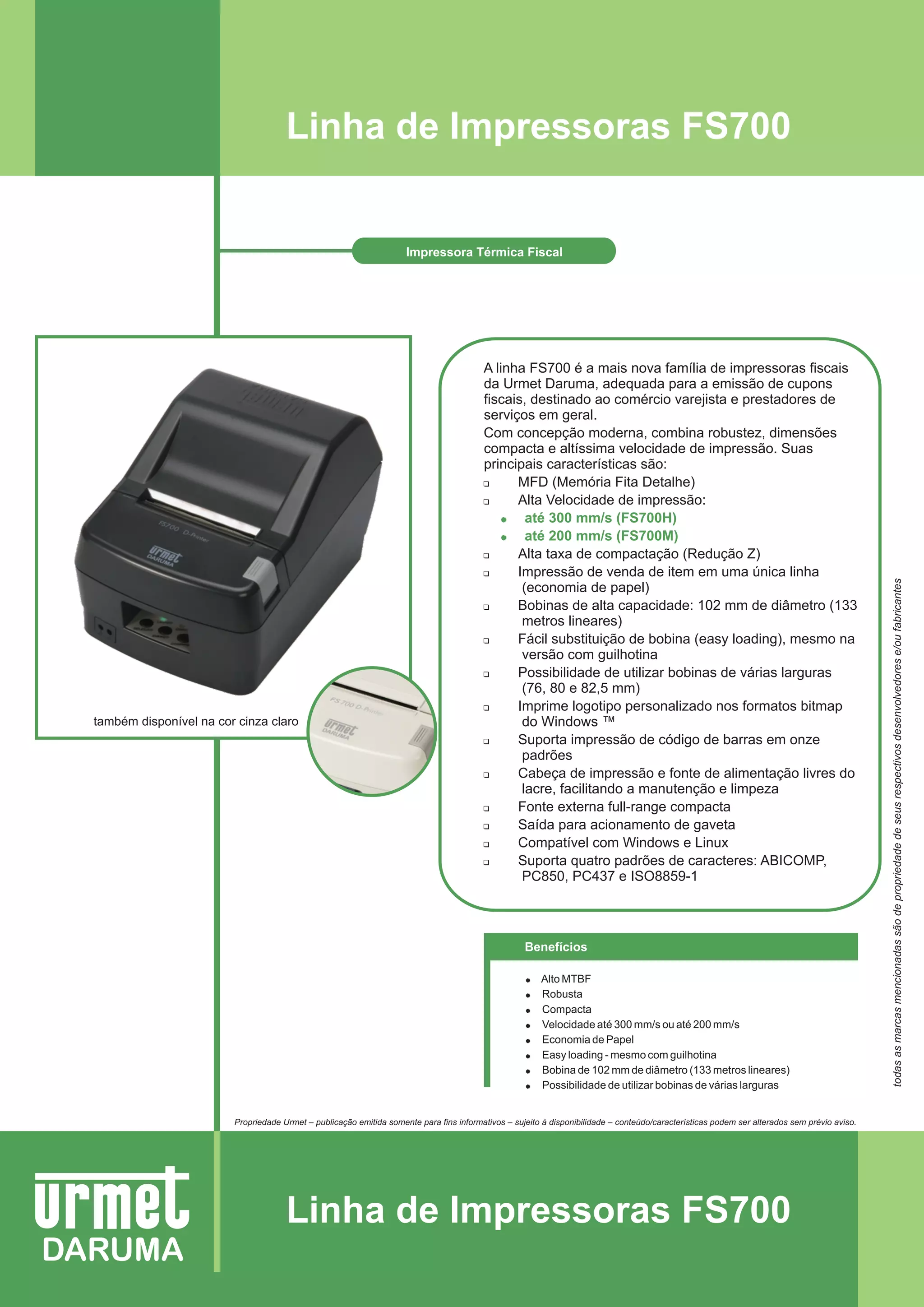 A linha FS700 da Urmet Daruma é uma família de impressoras fiscais compactas e rápidas destinadas ao varejo. Possuem velocidades de impressão de até 300mm/s ou 200mm/s, bobinas de grande capacidade e fácil substituição, e suporte a códigos de barras e logotipos personalizados.