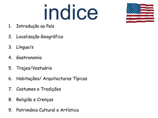 O documento fornece um resumo dos Estados Unidos, descrevendo sua localização geográfica na América do Norte, com o inglês como língua principal. Apresenta detalhes sobre a culinária, vestuário casual, casas grandes e padronizadas, tradições como casamentos sem igreja e presentes em dinheiro, e o cristianismo como principal religião.