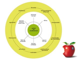 O documento discute princípios e metas de design de interação e usabilidade, incluindo facilidade de aprendizado, eficiência, minimização de erros e satisfação do usuário. Também aborda metas de user experience como satisfação, utilidade e motivação.