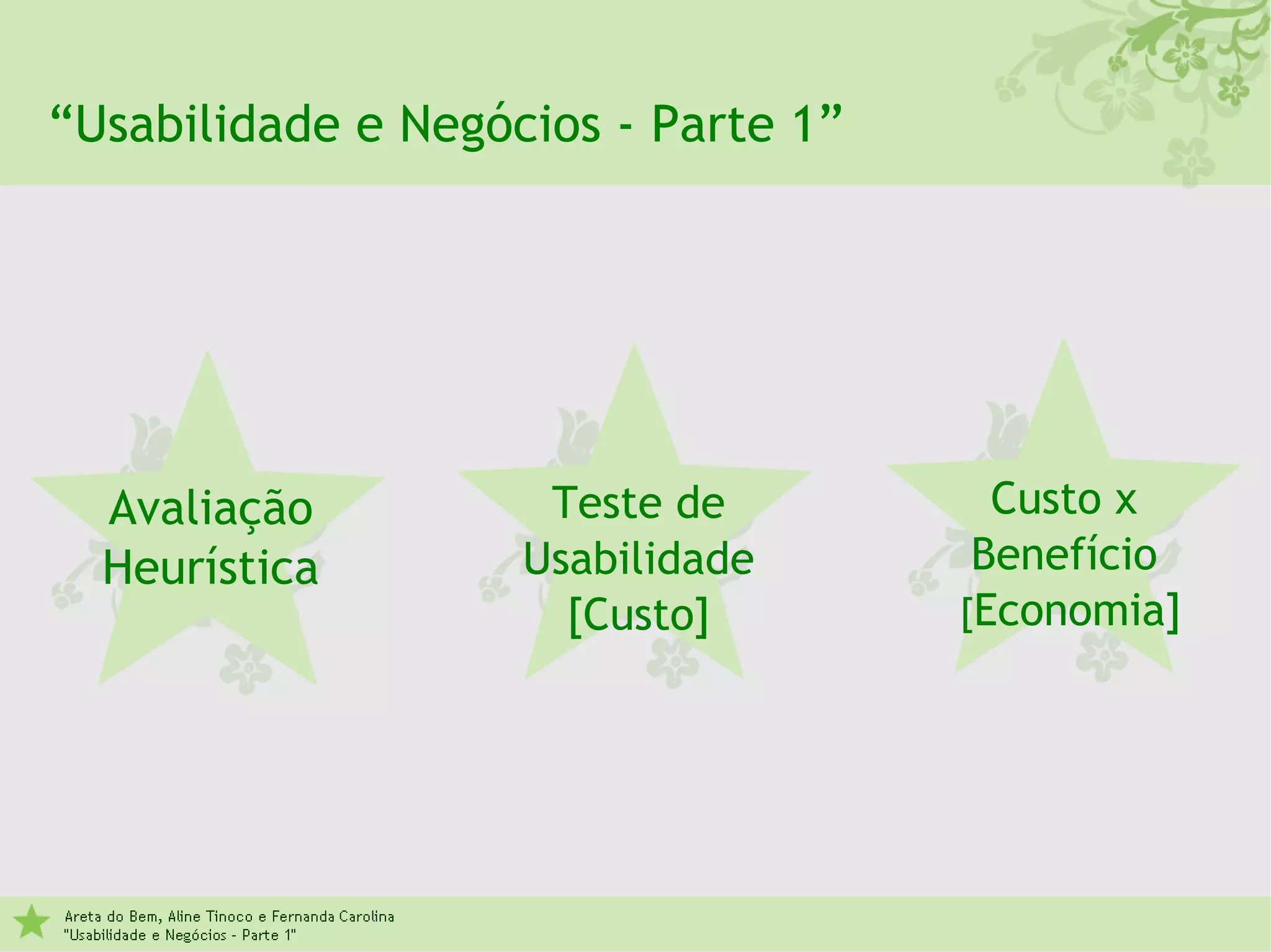 O documento discute os conceitos de usabilidade, avaliação heurística, teste de usabilidade e relação entre custo e benefício na usabilidade. A avaliação heurística é uma forma barata de avaliar sites usando as 10 heurísticas de Nielsen, enquanto os testes de usabilidade com usuários reais são mais caros. Investir na usabilidade desde o início reduz custos e aumenta benefícios como satisfação do usuário e valor da marca.