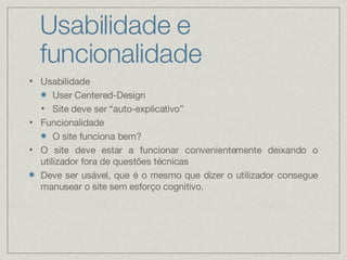 Este documento discute a importância da usabilidade e funcionalidade no design de sites. Ele explica que os sites devem ser auto-explicativos e funcionar bem para o usuário sem problemas técnicos. Também discute problemas comuns de usabilidade como vocabulário confuso e design pouco claro, e fornece dicas sobre como criar uma hierarquia visual clara e separar áreas de forma definida.