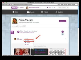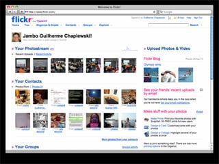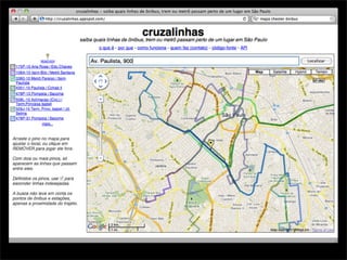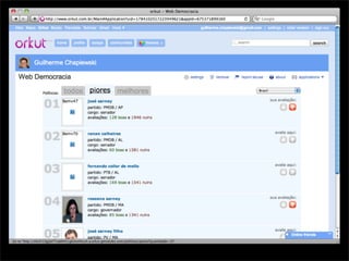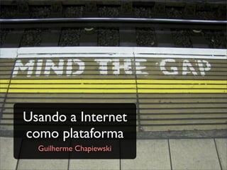 O documento discute como a internet pode ser usada como uma plataforma para criar e hospedar aplicativos e serviços. Ele explica como dados e APIs de sites populares podem ser combinados para gerar novos aplicativos, e como a internet fornece infraestrutura e recursos para desenvolvimento sem necessidade de outros softwares. A mensagem central é que a internet em si pode servir como plataforma se seus recursos e dados forem abertos e compartilhados.