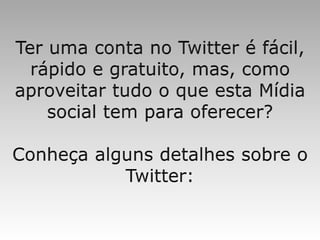 O Twitter permite mensagens curtas de até 140 caracteres chamadas tweets. Todas as mensagens públicas, exceto as diretas (DMs), podem ser vistas por qualquer um. As DMs são privadas entre os usuários que se seguem mutuamente. Hashtags agregam tweets sobre um mesmo assunto e podem ser usadas para divulgação.