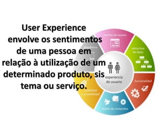 A experiência do usuário envolve os sentimentos de uma pessoa ao usar um produto ou serviço e destaca os aspectos afetivos e significativos da interação humano-computador. O design de experiência do usuário coordena diferentes disciplinas para garantir que os produtos forneçam recursos que permitam aos usuários criarem boas experiências. É importante considerar a experiência do usuário ao desenvolver software para entender as necessidades dos usuários e tornar a interação envolvente e impactante.
