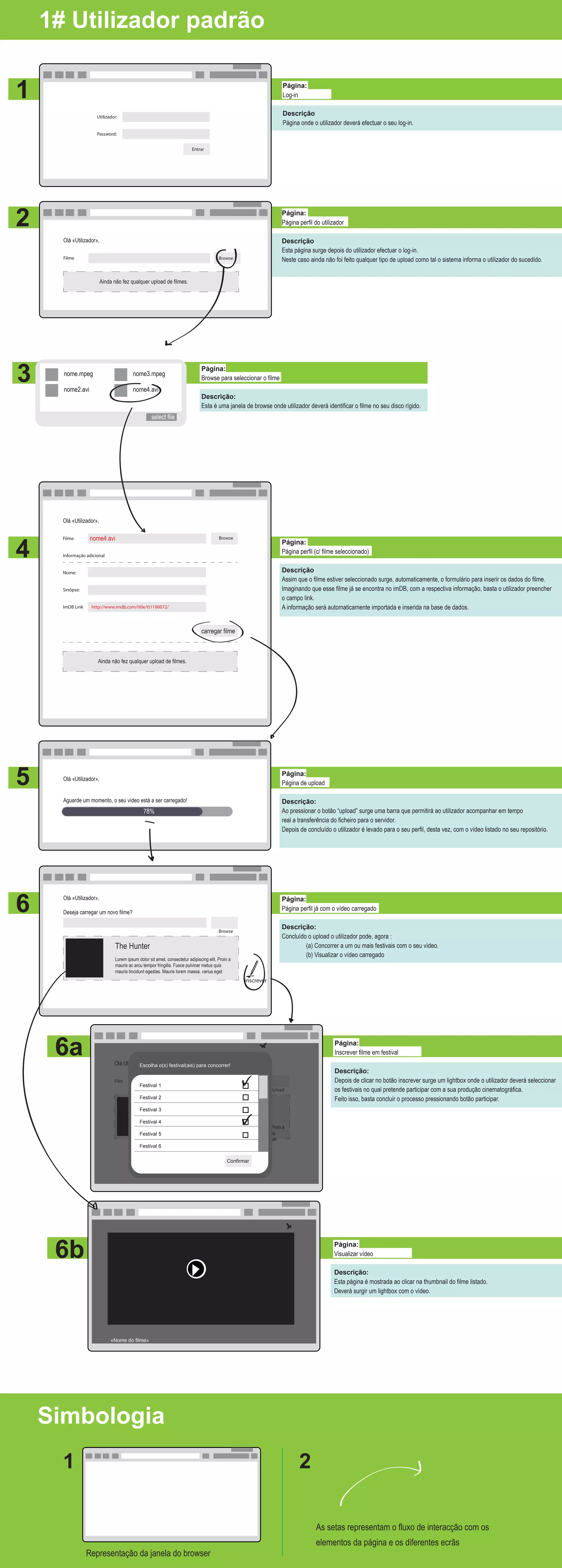 Este documento descreve as principais páginas de um sistema de gestão de festivais de cinema online. Inclui páginas como login, perfil do utilizador, seleção e upload de filmes, inscrição em festivais e visualização de vídeos.