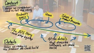 O documento descreve o processo de mapeamento de histórias de usuário (User Story Mapping) para planejamento de produtos digitais. Ele explica as 7 etapas do mapeamento: 1) definir a visão geral do produto, 2) criar o esqueleto do fluxo de trabalho do usuário, 3) adicionar histórias de usuário, 4) refinar as histórias, 5) detalhar as histórias, 6) definir o mínimo produto viável, e 7) planejar fases de lançamento. O objetivo é est
