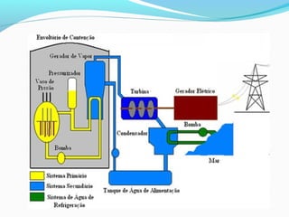 O documento explica o que é uma usina nuclear, seu funcionamento baseado na fissão nuclear do urânio para gerar energia térmica e transformá-la em energia elétrica. Detalha as três fases do processo - primária, secundária e de refrigeração - e aborda questões de segurança, aplicações no Brasil e vantagens e desvantagens deste tipo de geração de energia.