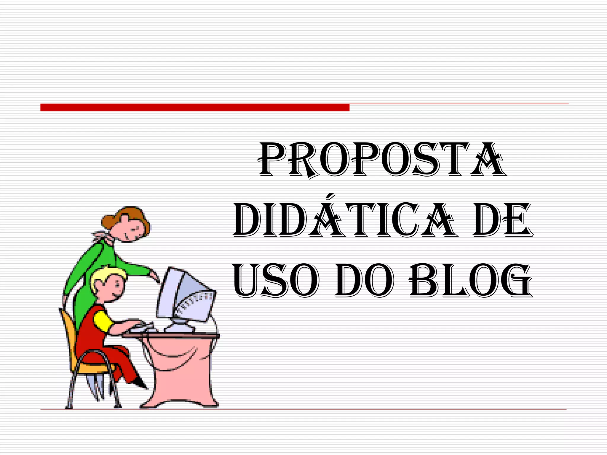 Este documento propõe o uso do blog na sala de aula para que os alunos construam seu próprio ambiente de aprendizagem, expressão e colaboração. O blog será usado para publicar textos de pesquisa, interagir com colegas, promover trabalho colaborativo e autoavaliação. O documento detalha as etapas de criação do blog da turma, com a definição de títulos, regras e atividades dos alunos, como a postagem de textos e imagens. A avaliação será subjetiva, observando