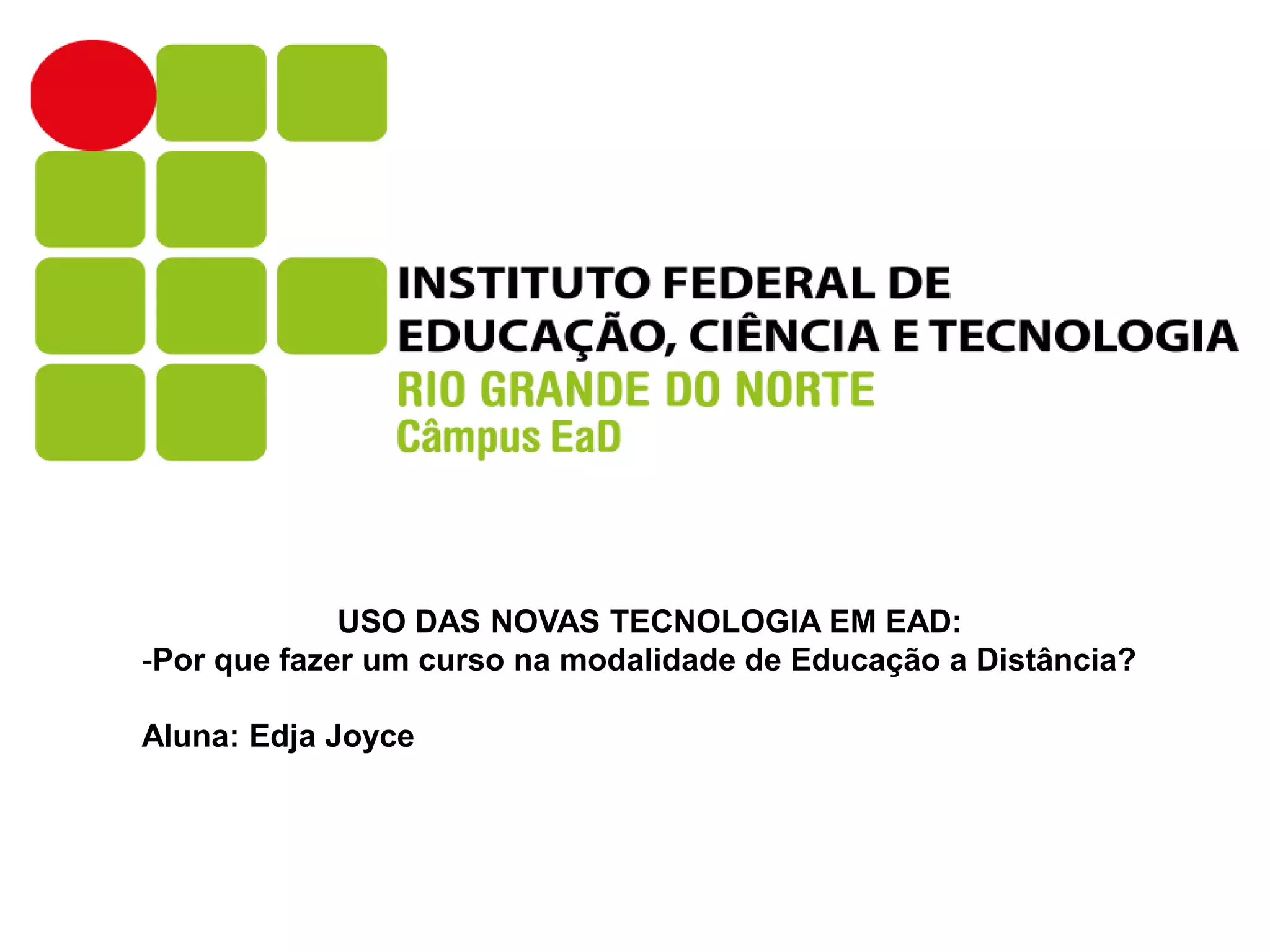 Educação a distância é um processo de ensino-aprendizagem mediado por tecnologia onde professores e alunos estão separados espacialmente. As novas tecnologias permitem diferentes modalidades como educação presencial, semipresencial e a distância. A educação a distância estimula os alunos a serem pesquisadores e abre possibilidades de aprendizagem ao longo da vida.