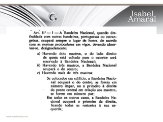 O documento descreve as regras protocolares para o uso de bandeiras em Portugal. Estipula que a bandeira portuguesa deve ocupar sempre o lugar de honra, à direita de quem está voltado para o exterior, quando desfraldada com outras bandeiras. Quando há três mastros, a bandeira nacional deve ficar no mastro central. Com mais de três bandeiras em edifícios, a bandeira nacional fica no centro ou à direita do centro, dependendo do número par ou ímpar de mastros.