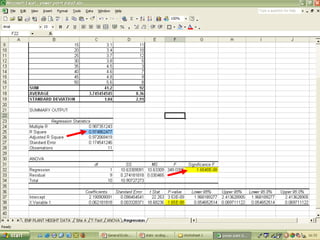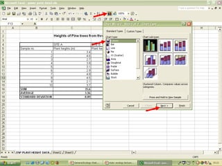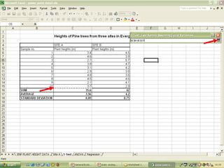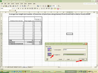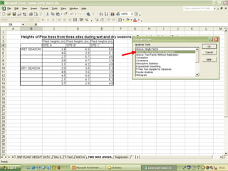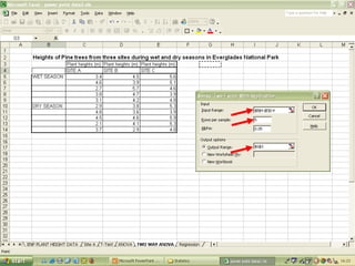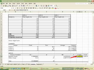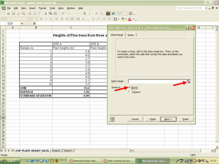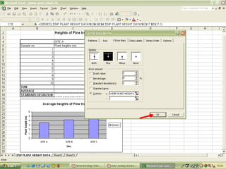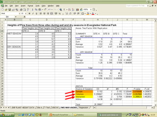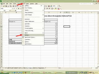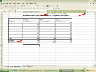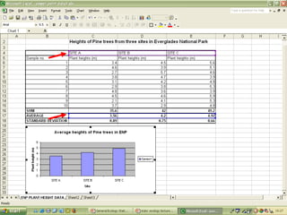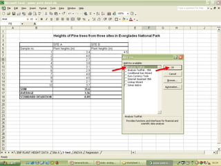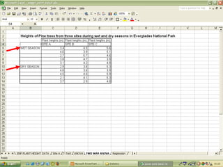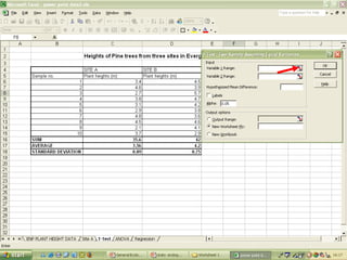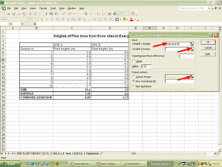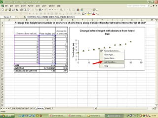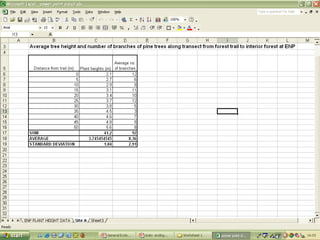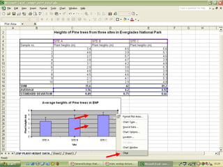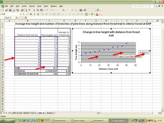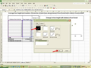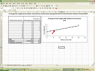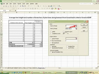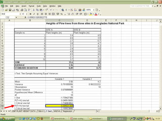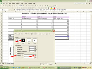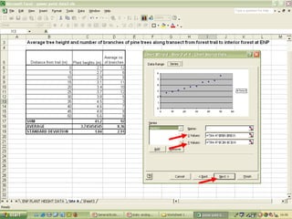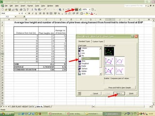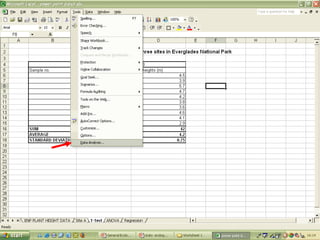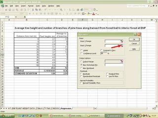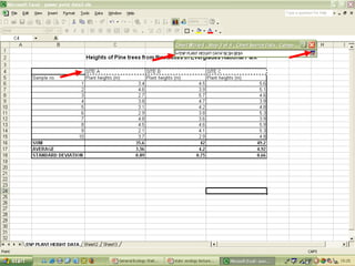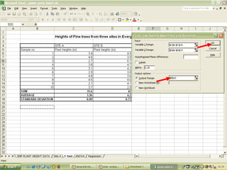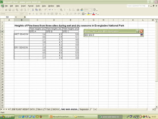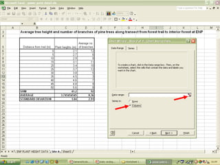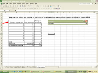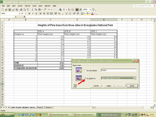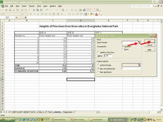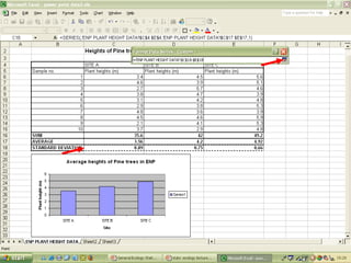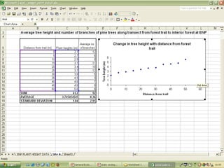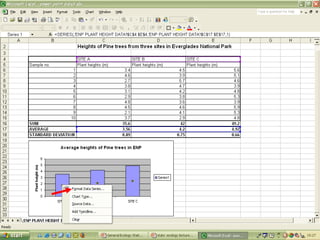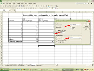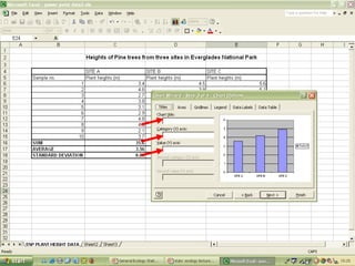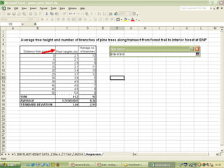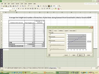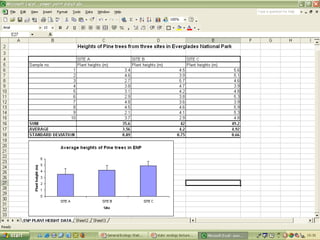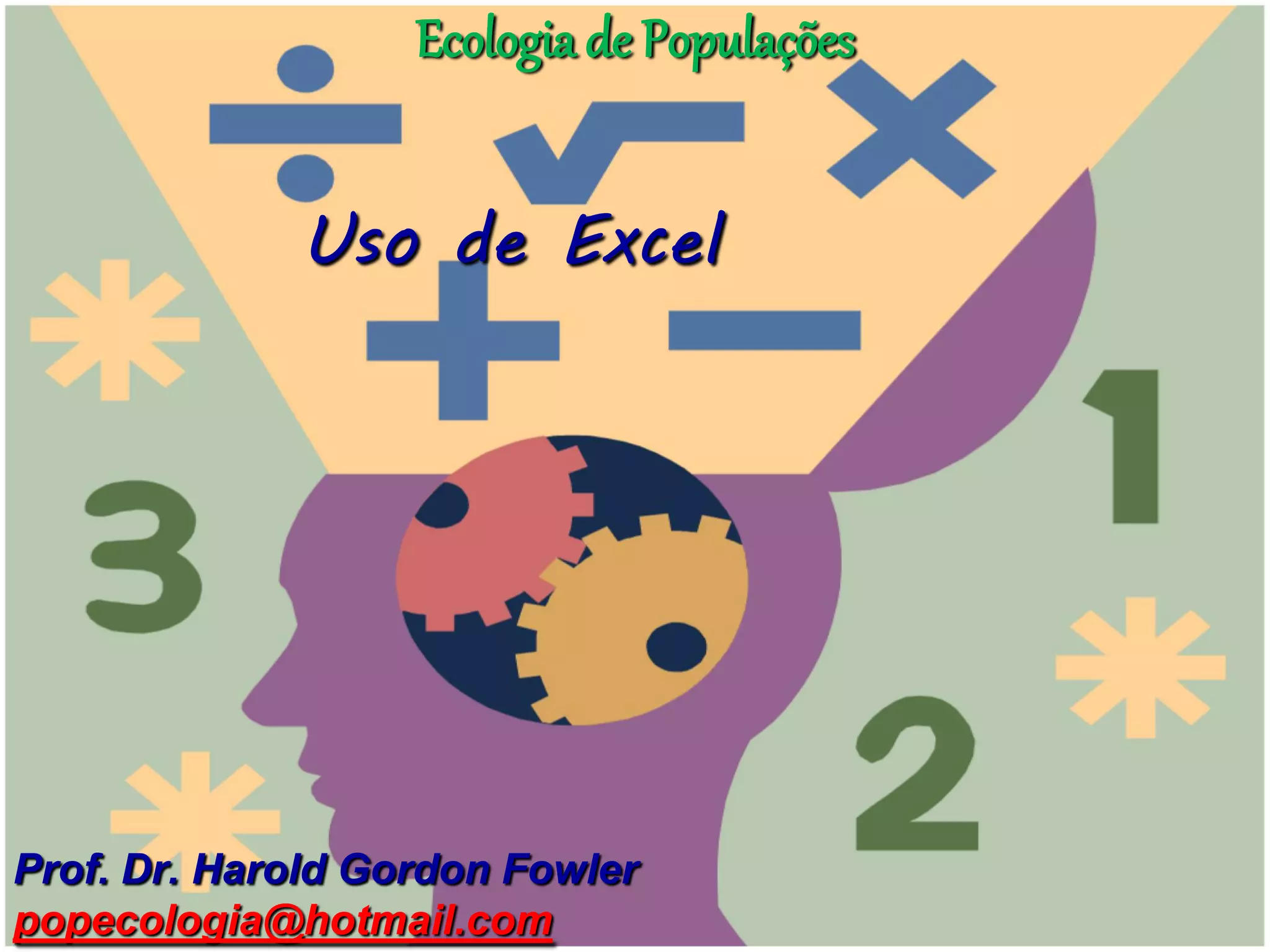 O documento descreve o uso do Excel para análise de dados ecológicos de populações, incluindo organização de dados em tabelas, produção de gráficos, e realização de testes estatísticos como t-test, ANOVA e regressão linear.
