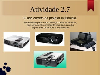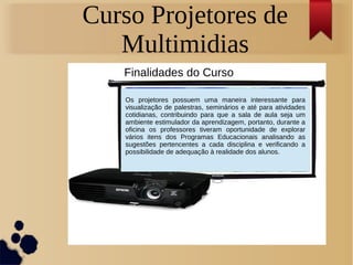 O documento discute o uso correto de projetores multimídia na educação, ressaltando sua importância para tornar as aulas mais dinâmicas e motivadoras. Durante um curso, professores aprenderam a utilizar essas ferramentas, resultando em apresentações criativas desenvolvidas por equipes de alunos. A conclusão destaca que o uso de tecnologias ajudou a promover um ambiente de aprendizagem mais interativo e estimulante.
