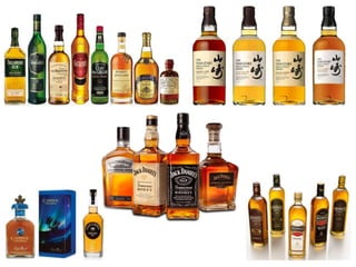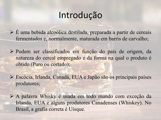 O documento resume o processo de produção de uísque, começando pela descrição das matérias-primas usadas como cevada, milho e outros cereais. Explica as etapas do processo como a maltagem da cevada, moagem, cozimento, fermentação e destilação para produzir o destilado de uísque.