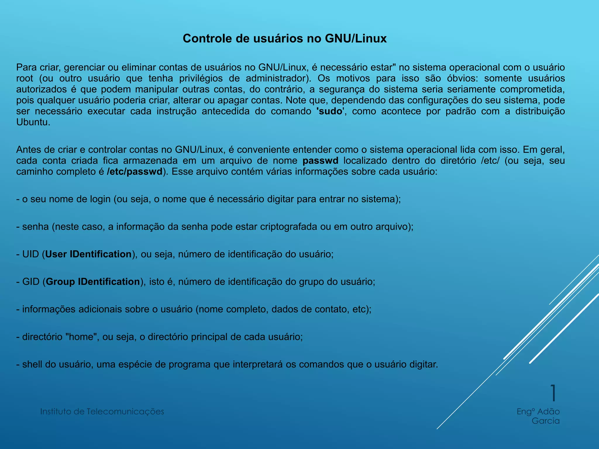 O documento discute o gerenciamento de contas de usuários no GNU/Linux, incluindo a criação, edição e remoção de contas, além de grupos. Explica que as informações dos usuários são armazenadas no arquivo /etc/passwd e que os comandos adduser e passwd permitem adicionar e alterar senhas de usuários.