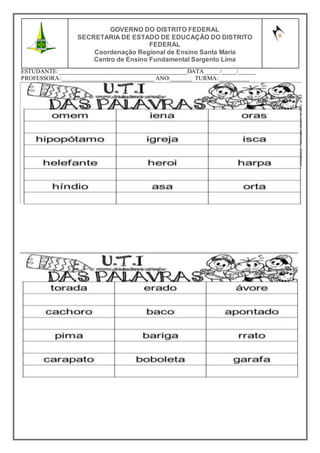 O documento fornece informações sobre um estudante em uma escola pública no Distrito Federal, Brasil, incluindo o nome do estudante, data, professor, ano letivo e turma.