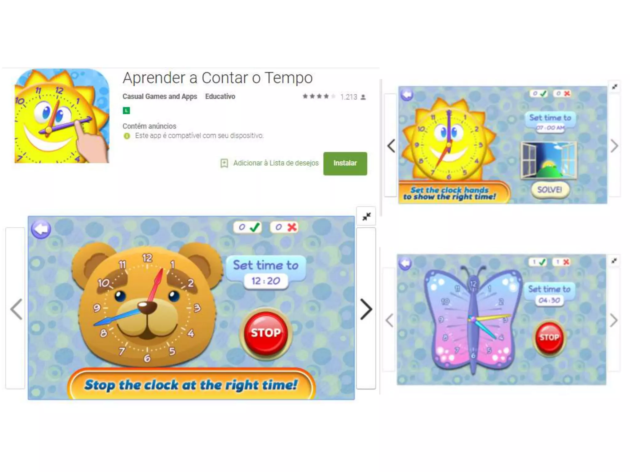 Este aplicativo ensina crianças a ler relógios analógicos e digitais através de jogos interativos com ponteiros móveis e temas de animais. Ele é recomendado para crianças de pré-escola e de 7 anos para que aprendam a contar o tempo de maneira divertida e interessante.