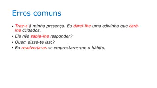 O documento discute regras para o uso correto dos pronomes pessoais átonos em português. Ele explica que esses pronomes geralmente vêm depois dos verbos nos tempos simples e antes dos verbos auxiliares ou principais nos tempos compostos. Também discute exceções como a colocação dos pronomes antes do verbo em frases negativas ou interrogativas.