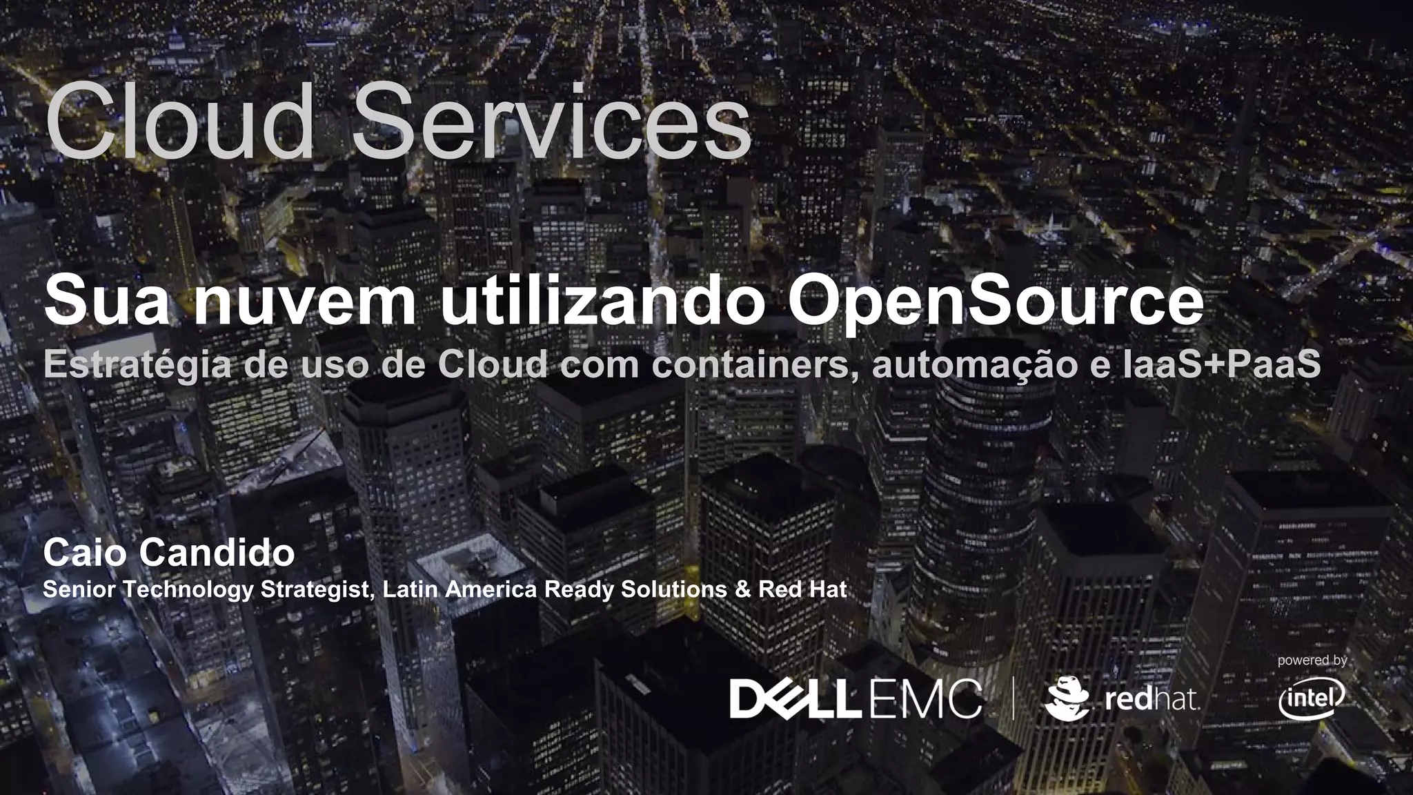 O documento discute estratégias de uso de nuvem com containers, automação e IaaS + PaaS. A adoção de containers permite compartilhar e implantar aplicações facilmente e ferramentas de DevOps ajudam a entregar uma esteira de integração e entrega contínuas. O Red Hat OpenShift é uma plataforma para aplicações em containers baseada em Kubernetes que fornece serviços de infraestrutura e automação do ciclo de vida.