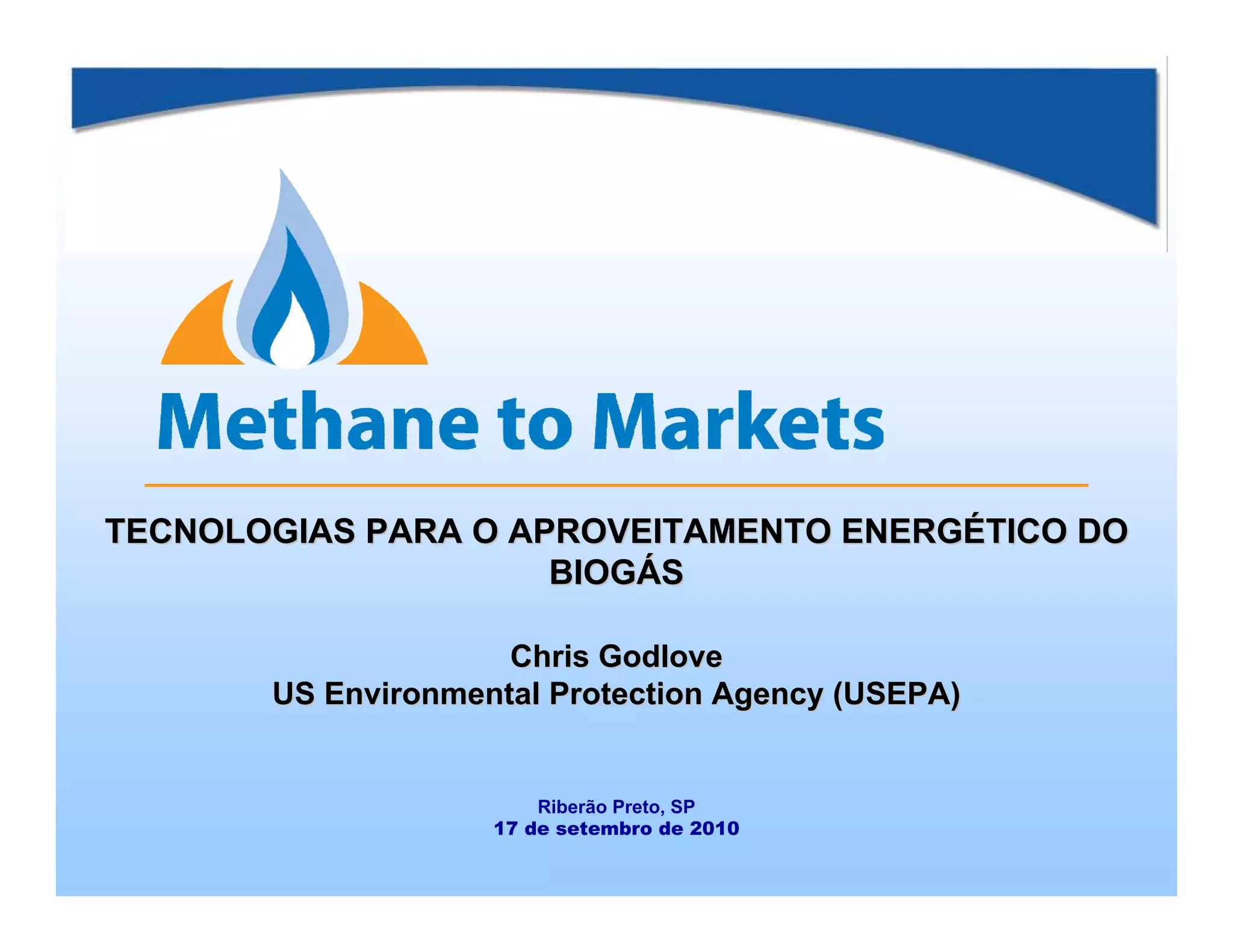 O documento discute as tecnologias para aproveitamento energético do biogás, incluindo seu uso direto como combustível de baixa e alta densidade térmica, geração de eletricidade e cogeração. As opções de aproveitamento incluem aquecimento, veículos e injeção em gasodutos.