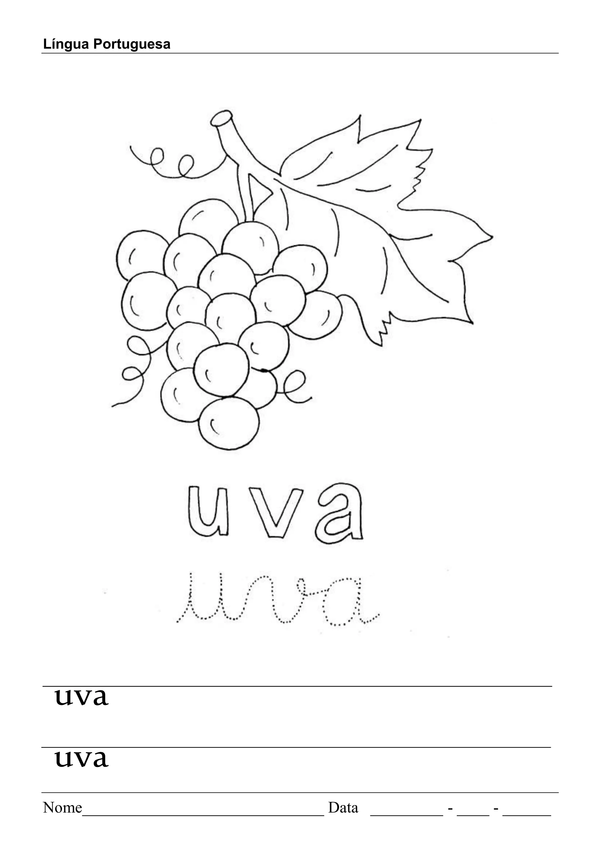 Este documento parece ser uma folha de exercícios de português para crianças, com apenas uma palavra escrita duas vezes: "uva".