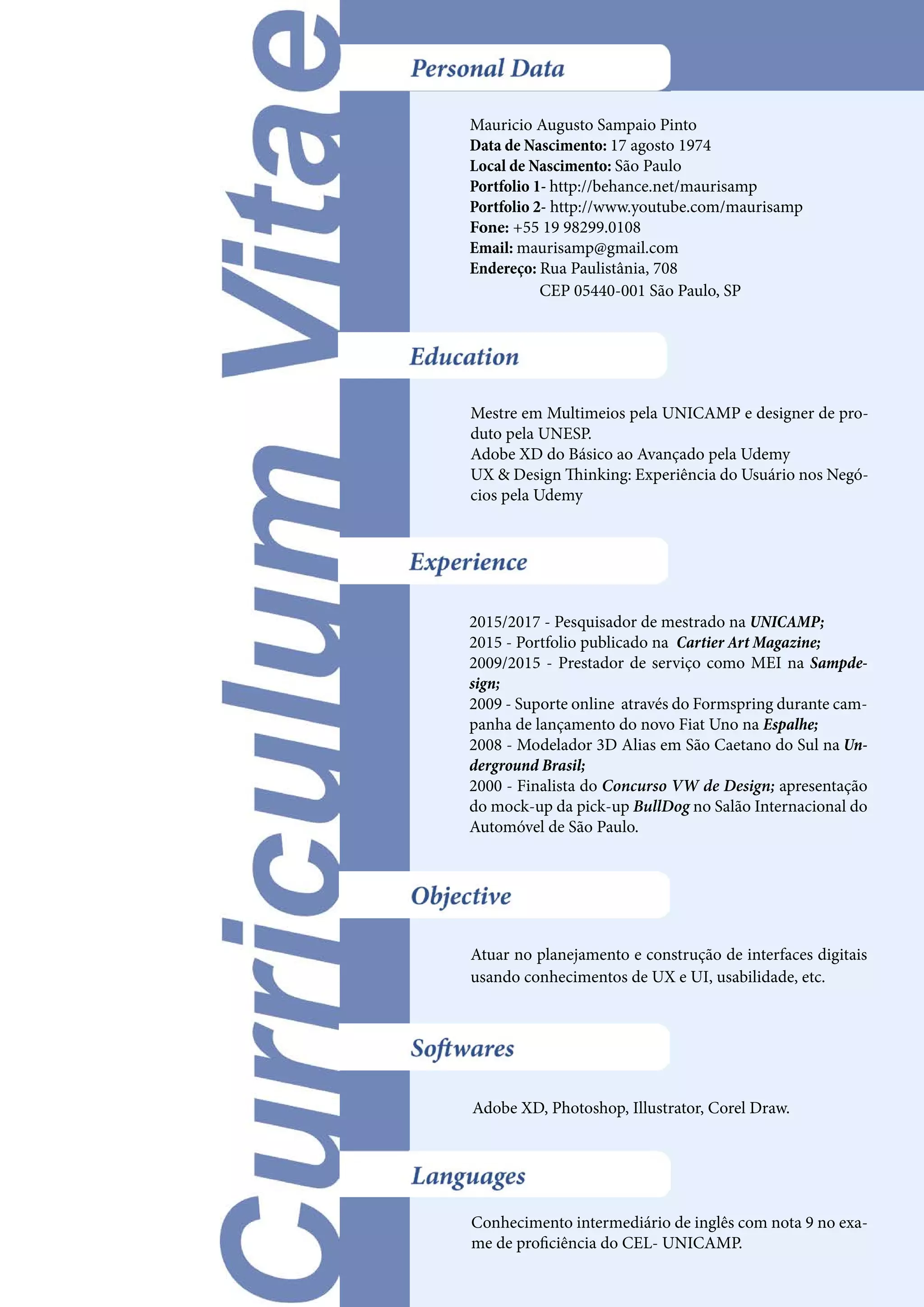 Mauricio Augusto Sampaio Pinto é um designer de produto e mestre em multimeios formado pela UNICAMP e UNESP. Ele possui experiência em planejamento de interfaces digitais usando UX e UI, além de ser fluente em ferramentas como Adobe XD, Photoshop e Illustrator. Seu portfólio inclui projetos para marcas como Fiat, Cartier e Volkswagen.