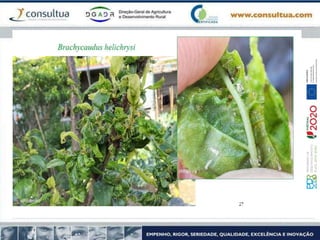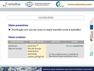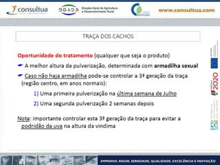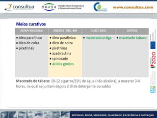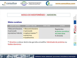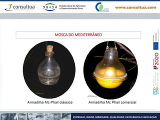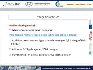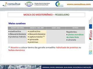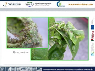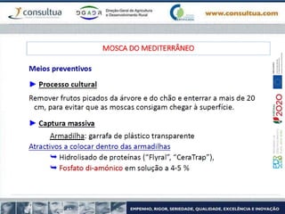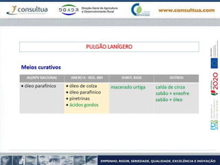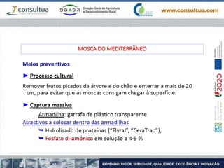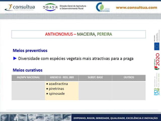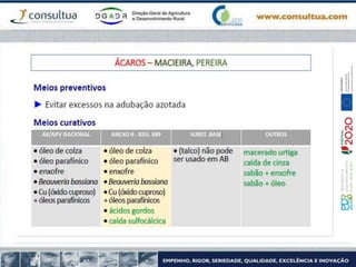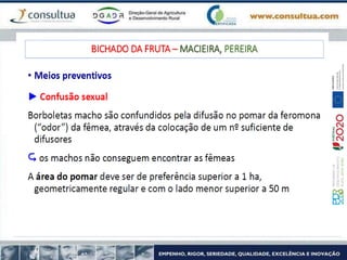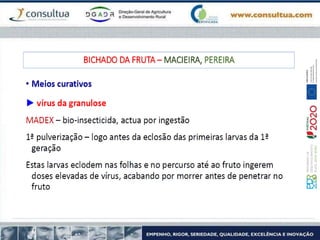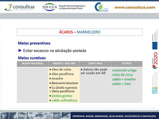 O documento discute vários tipos de pragas que afetam macieiras, pereiras e outras fruteiras, incluindo ácaros, afídeos, bichado da fruta, broca-zêuzera, mosca do mediterrâneo, cicadelhas e traças dos cachos. Ele fornece detalhes sobre a identificação dessas pragas e métodos preventivos e de controle, como repelentes, confusão sexual, captura massiva e sabão com enxofre.