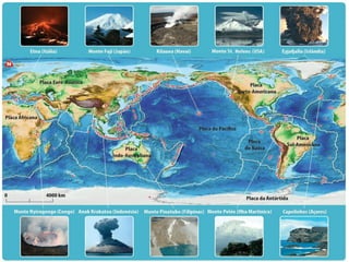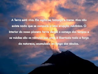 O documento fornece informações sobre vulcanismo, discutindo a distribuição geográfica dos vulcões, os tipos de vulcanismo, as características dos vulcões, os materiais libertados durante erupções, os tipos de erupções e a formação de caldeiras.