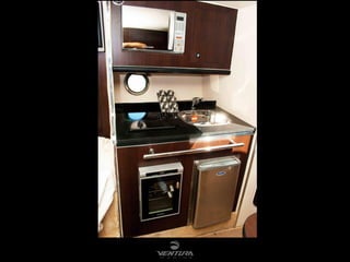 Este documento fornece as principais características e diferenciais de um barco de 9,8 metros de comprimento, com capacidade para 12 passageiros durante o dia e 4 adultos e 1 criança durante a noite, que possui um dos projetos mais modernos da categoria com maior espaço interno e acessibilidade.