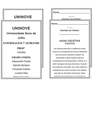 O documento explica que as vacinas estimulam a defesa do corpo contra vírus e bactérias através da produção de anticorpos. Quando uma pessoa é vacinada, seu corpo detecta a substância da vacina e produz anticorpos que permanecem no organismo para fornecer proteção contra doenças.